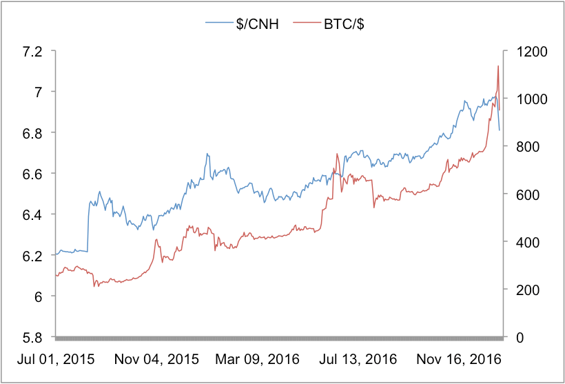 Chinese bets against the renminbi have snowballed since Beijing let it fall by 2% against the dollar in August 2015, the first revaluation in years. And, as this chart shows, the renminbi and the bitcoin rate to the dollar have become increasingly closely correlated (though bitcoin’s rise, in percentage terms, has of course been far more dramatic).