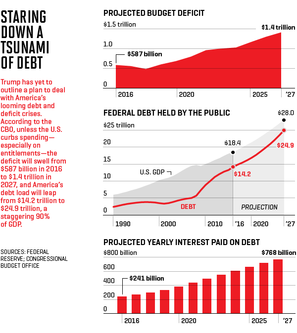 Conservative economists who support the tax and regulatory portion of his agenda are extremely wary about his instincts on trade. Trump has threatened Mexico and China with tariffs ranging from 20% to 45%—a strategy theoretically intended to lower our trade deficits with the two largest exporters to the U.S. that could backfire bigly. “The big risk to his success is a trade war,” says Douglas Holtz-Eakin, the president of the American Action Forum and a former director of the Congressional Budget Office under George W. Bush.