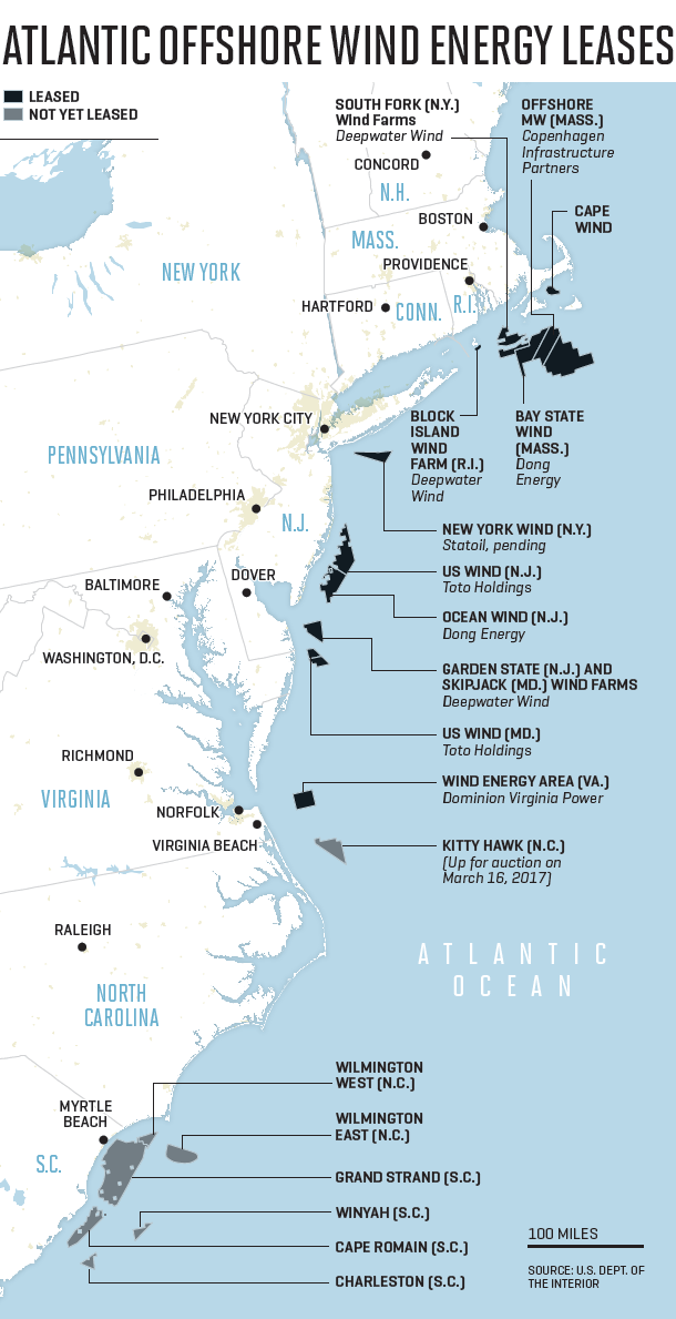 Such technological progress will need to overcome the changed political climate in Washington. The new administration is unabashedly hostile to renewable energy, and soon after Trump’s Inauguration the White House took down all mention of climate change on its website. Still, there are good political and economic reasons to support offshore wind. This fledgling industry is just the kind of heavy steel and construction project that the new President envisions for his infrastructure program. And offshore could bring a dollop of sorely needed revenue to the Treasury. The DOE estimates that annual lease payments for offshore wind projects could total $440 million annually through 2050.