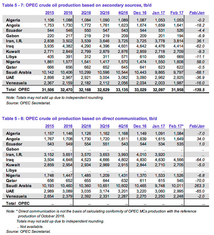 Smith said that irrespective of who is actually cheating or not on their agreed quota, the biggest problem is that the goal of ending the glut on world markets – the whole reason for the output restraint – is still far away. According to the OPEC report, inventories in developed economies actually rose in January (the last month for which data are available) after coming down slightly in previous months. At 3.006 billion barrels, they’re 10%, or 278 million barrels, above their five-year average.