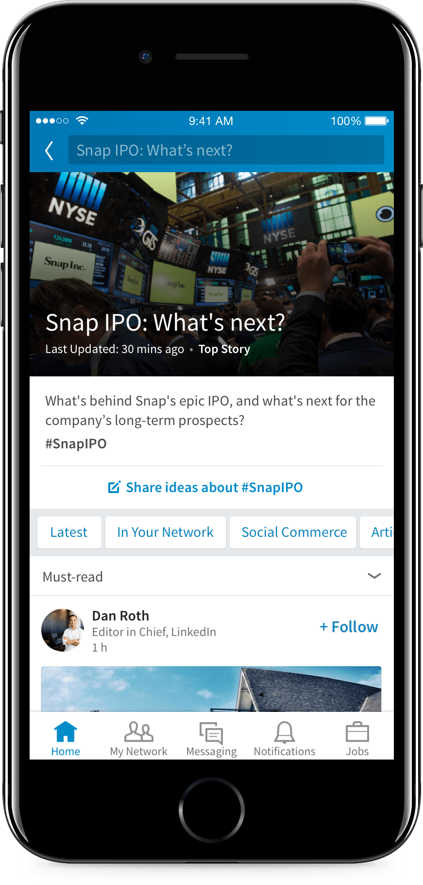 A user can scroll down the screen to see what the most popular topics are among co-workers or other connections. If he or she is in tech, for example, that person might see a feed all about the recent Snap (SNAP) initial public offering with linked stories from major publications or blogs. Then, he or she can then find new people to follow from that feed.