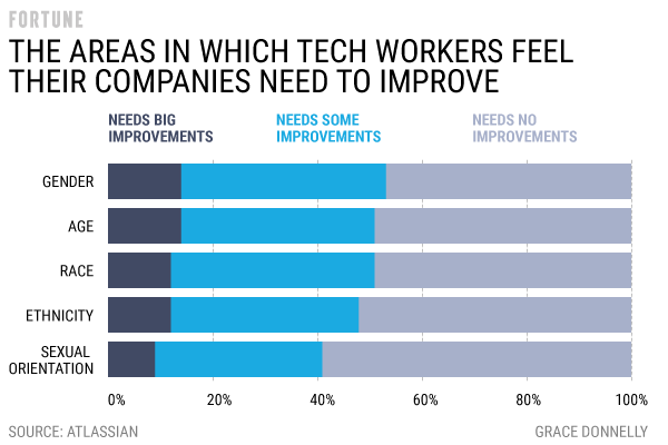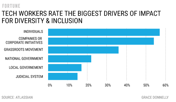 High profile edge cases, like the sexual harassment allegations at Uber, have the unfortunate effect of making ongoing diversity and gender equality issues seem insignificant in comparison. Seeing your company touting diversity initiatives rather than battling a public relations nightmare can convince an employee to give their employer the benefit of the doubt. And so it wasn’t entirely surprising, said the Atlassian report, that 60% percent of respondents gave their companies a passing grade without evidence of concrete action.