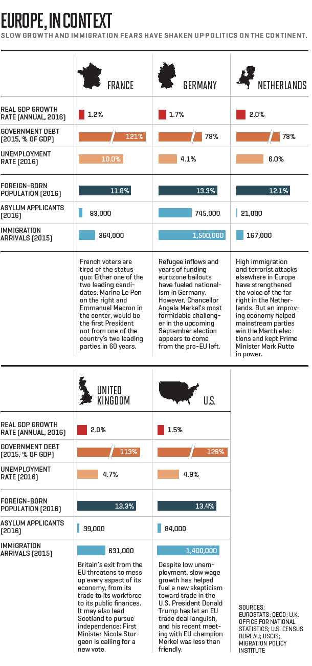 European populism has driven much of the unrest. Forces like globalization, refugee inflows, and fights over austerity have given grist to both far-right movements in the north (like Germany’s Alternative for Deutschland) and their left-leaning counterparts in the south (see Greece’s Syriza).