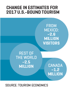 Tourism Economics, a firm that provides U.S. cities with international travel projections, recently flipped its forecast for growth in 2017 and now expects as many as 6.3 million lost visits to the U.S. next year, representing $10.8 billion in spending.