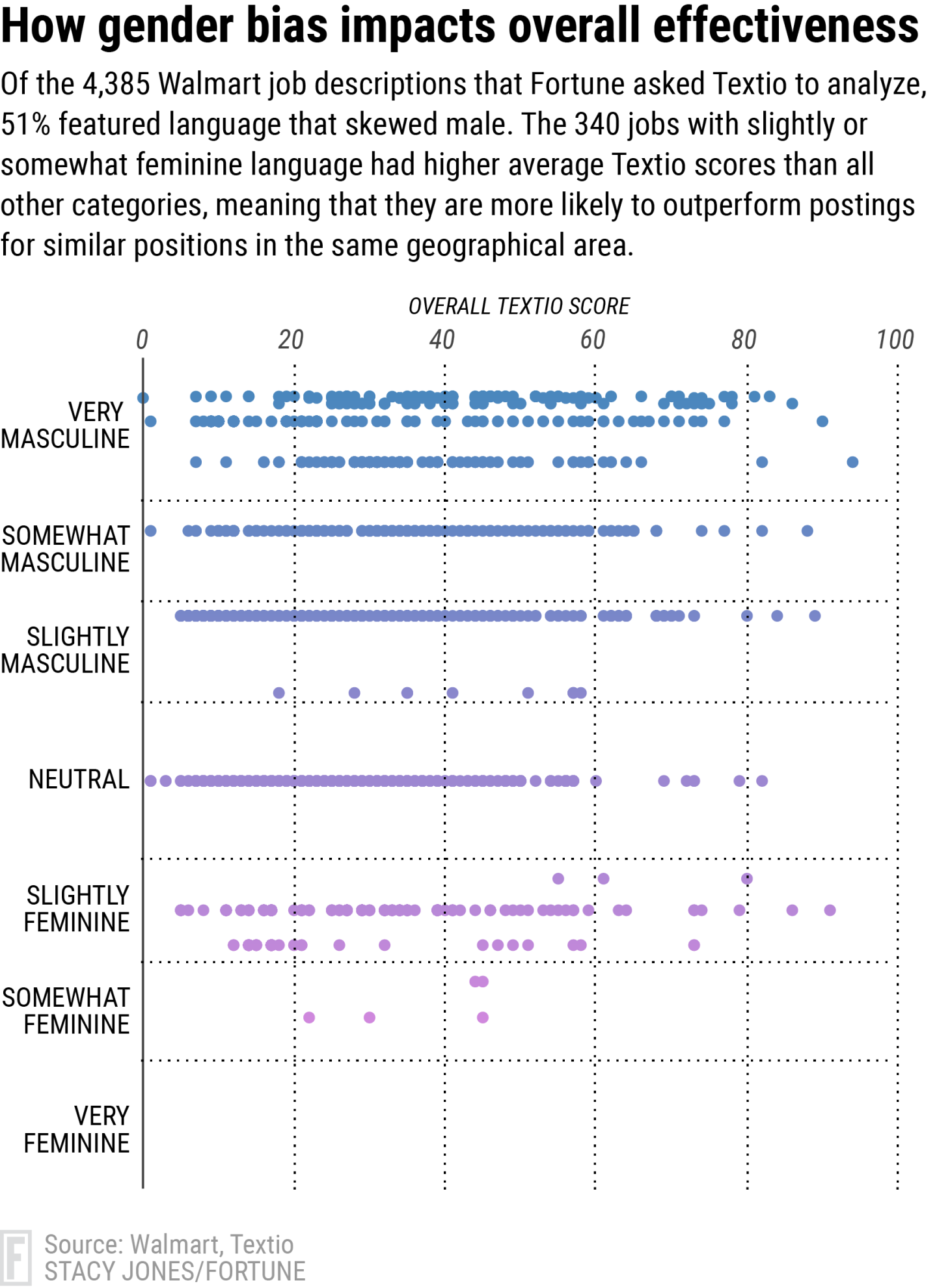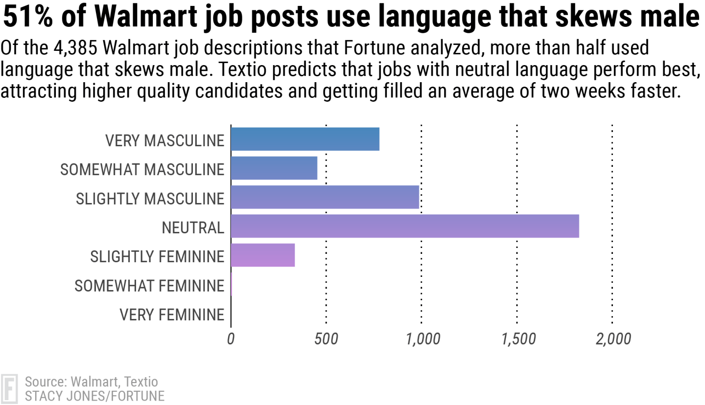 In an attempt to get a sense of how effective the revamped site is likely to be in terms of attracting diverse candidates, Fortune and Textio analyzed thousands of Walmart job descriptions between January and March.