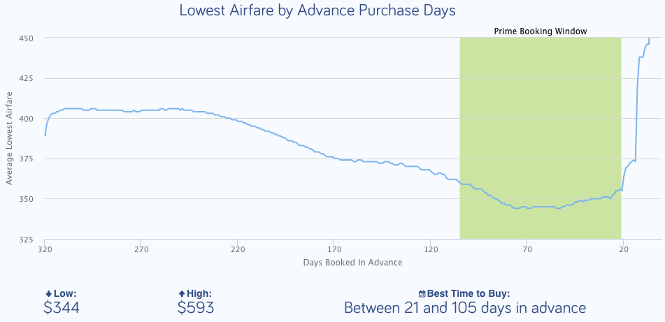 The study found that “first dibs” tickets — six to 11 months in advance — tend to be on the higher side, as flights have just opened and airlines are less desperate to make sales. Even “peace of mind” tickets — three and a half to six months in advance — can have moderately pricey fares, though there are typically more affordable fares than first dibs. Three weeks to three and a half months is the “prime booking window.” Any shorter and you’ll “push your luck” (two to three weeks) or risk a “Hail Mary” (zero to two weeks).