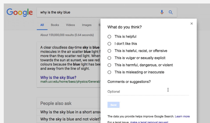 Now, there are more ways to tell if those information boxes (which Google calls snippets) contain inaccurate information—for instance, if a box about creationism appeared in response to a question about evolution. Here is a screenshot the tool in action for when someone asks “why is the sky blue.”
