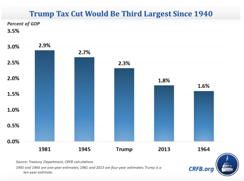 While President Trump’s tax reform proposals announced Wednesday would be large, they would fall in third place as the biggest U.S. tax cut since 1940. That’s according to very rough estimates by the Committee for a Responsible Federal Budget, a nonpartisan group focused on reducing federal deficits and debt.