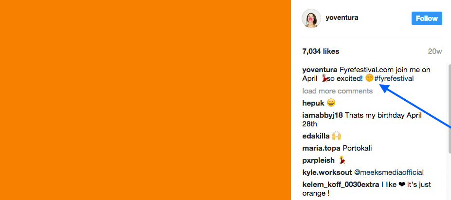 A handful of the endorsements remain up. As NPR discovered, Fyre-related posts from at least three of the influencers can still be found. In each case the promotional post is simply an orange square (presumably tied to a marketing scheme) posted by the influencer along with shout-out the festival. Here’s an example: