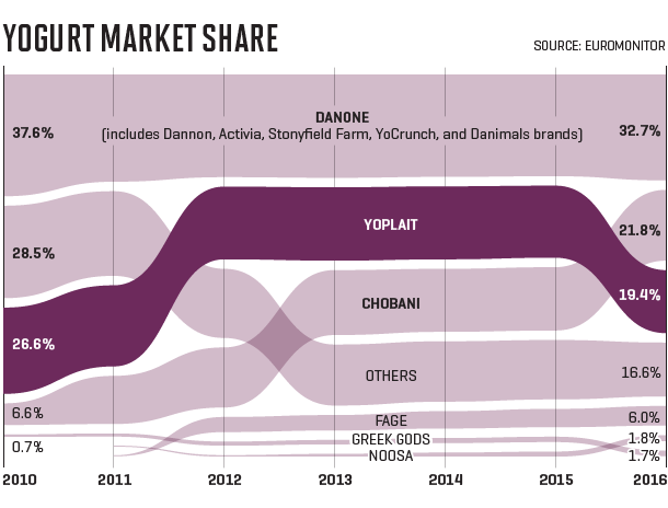Today, Greek styles make up 50% of U.S. yogurt sales. Chobani is easily No. 1 in that grouping, followed by Fage and Oikos. Yoplait’s Greek 100 ranks fourth. Chobani thinks overall yogurt sales could double to $16 billion within five years. “This category is in its infancy,” says its CMO, Peter McGuinness. Just one of every three Americans ate a Greek yogurt in the past year. His company, which hasn’t been immune to the occasional stumble, including a significant recall, still has plenty of room for growth.
