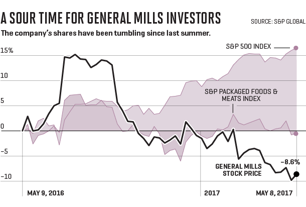 General Mills needs to act. Its shares have slumped by 9% over the past year, even as the S&P 500 chugged up by 15%. A low stock price, of course, is one thing that can make a company vulnerable to a takeover.