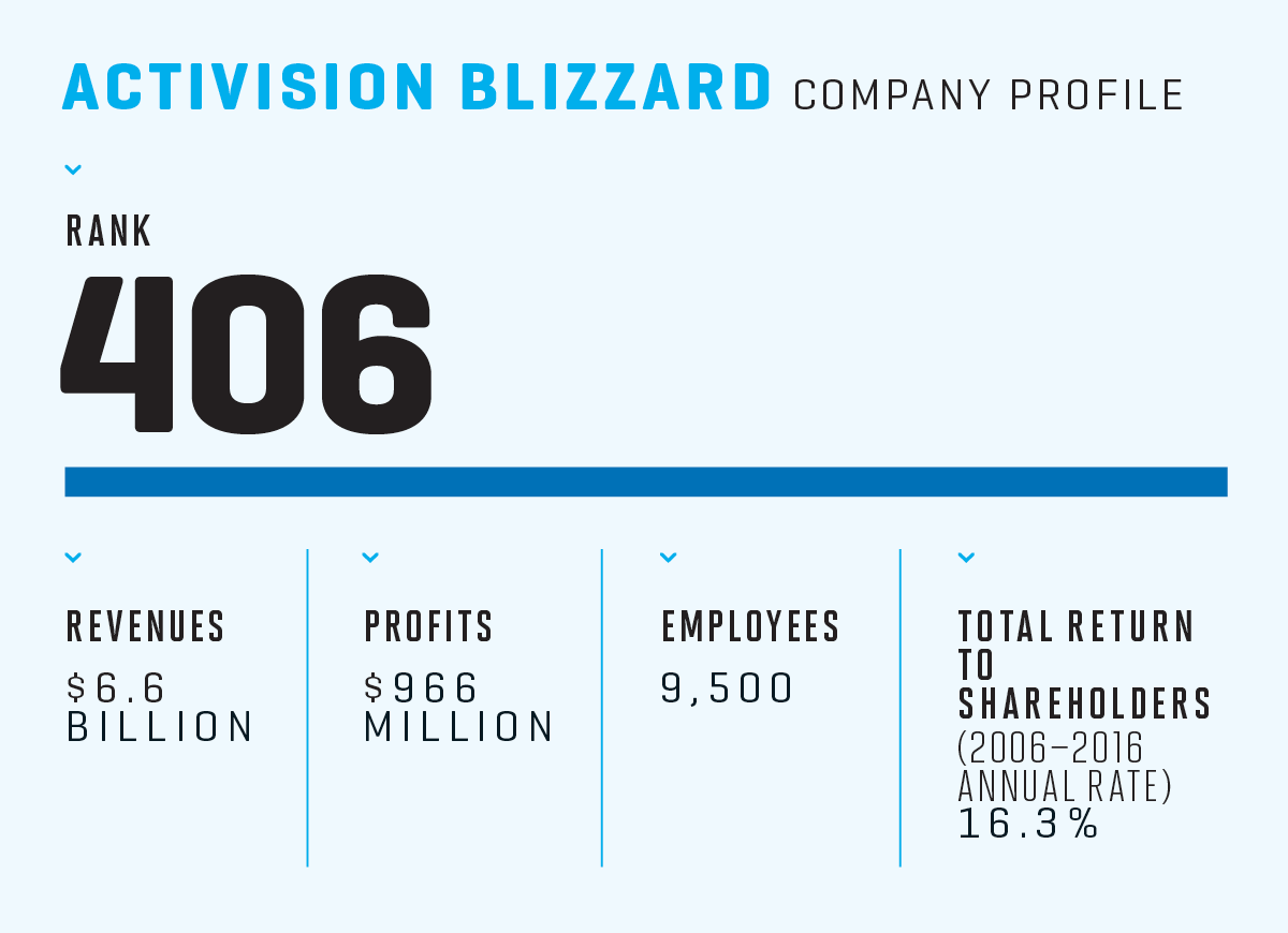 This year, Activision Blizzard earned a spot on the Fortune 500 list for the first time in the company’s 37-year history. In this industry, that’s very rare air. Only two other videogame-centric companies have ever made the Fortune 500: Electronic Arts (EA) and industry pioneer Atari. And neither had staying power: Electronic Arts graced the list just once, in 2010, while Atari lasted two years—1988 and 1989. (After several ownership changes and a bankruptcy, Atari is now part of a French media company.) The takeaway: Gaming may be mainstream entertainment, but game companies are hit-driven—and none has successfully expanded beyond videogames.