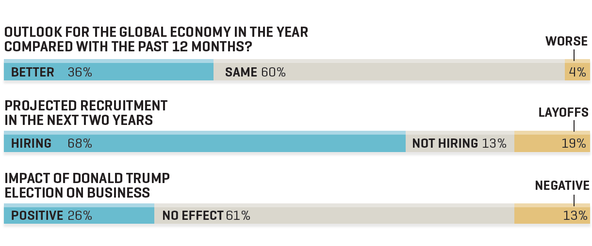 Only a few chief executives see the global economy turning worse next year. More than one-third anticipate that it will improve, and over half are expecting things to be about the same. The good news for workers? A strong majority of CEOs say they expect to boost hiring over the next couple of years. As for the Trump effect: not much so far.