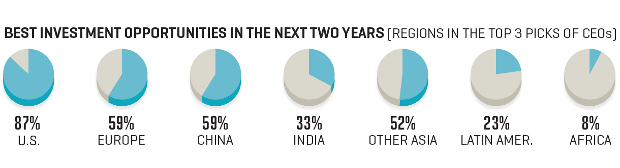 The U.S. is the overwhelming choice of CEOs for having the best investment opportunities in the next two years; China and Europe lag far behind.