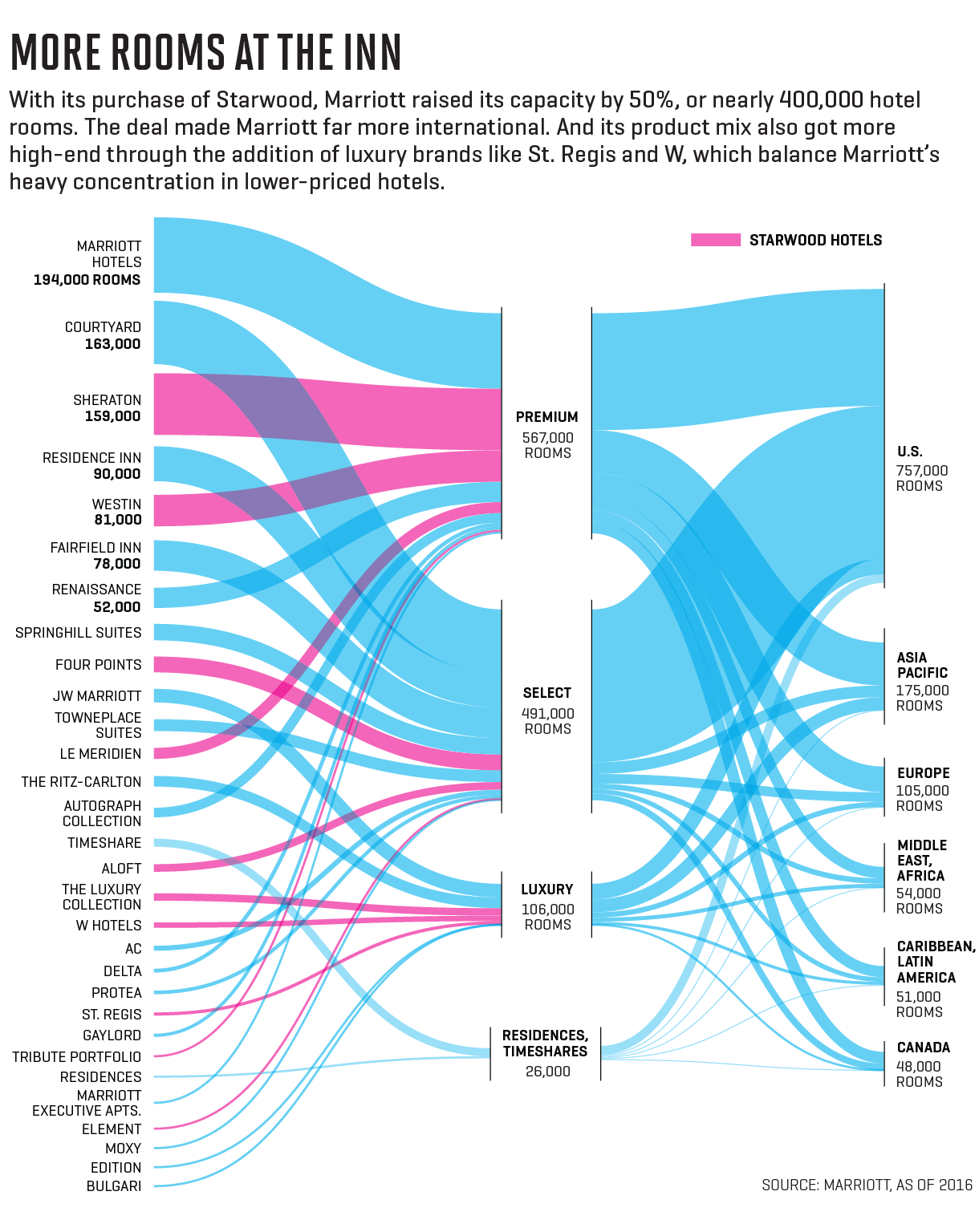 This deeply held conviction is a major reason why Sorenson engineered a transformative deal for his company: the $13.6 billion acquisition last September of Starwood Hotels & Resorts, which added such iconic brands as St. Regis, Westin, and W to Marriott’s roster, as well as profitable budget properties such as Four Points. Prior to the purchase, Marriott stood in a virtual tie with Hilton as the world’s largest hotel company. Now it towers over the field. The merger added 381,440 hotel rooms, swelling Marriott’s total portfolio to 1.203 million—50% larger than Hilton’s, and 62% greater than the room count at third-place InterContinental Hotels of the U.K. Today one in seven hotels in North America, and more than one in 14 worldwide, are controlled by Marriott.