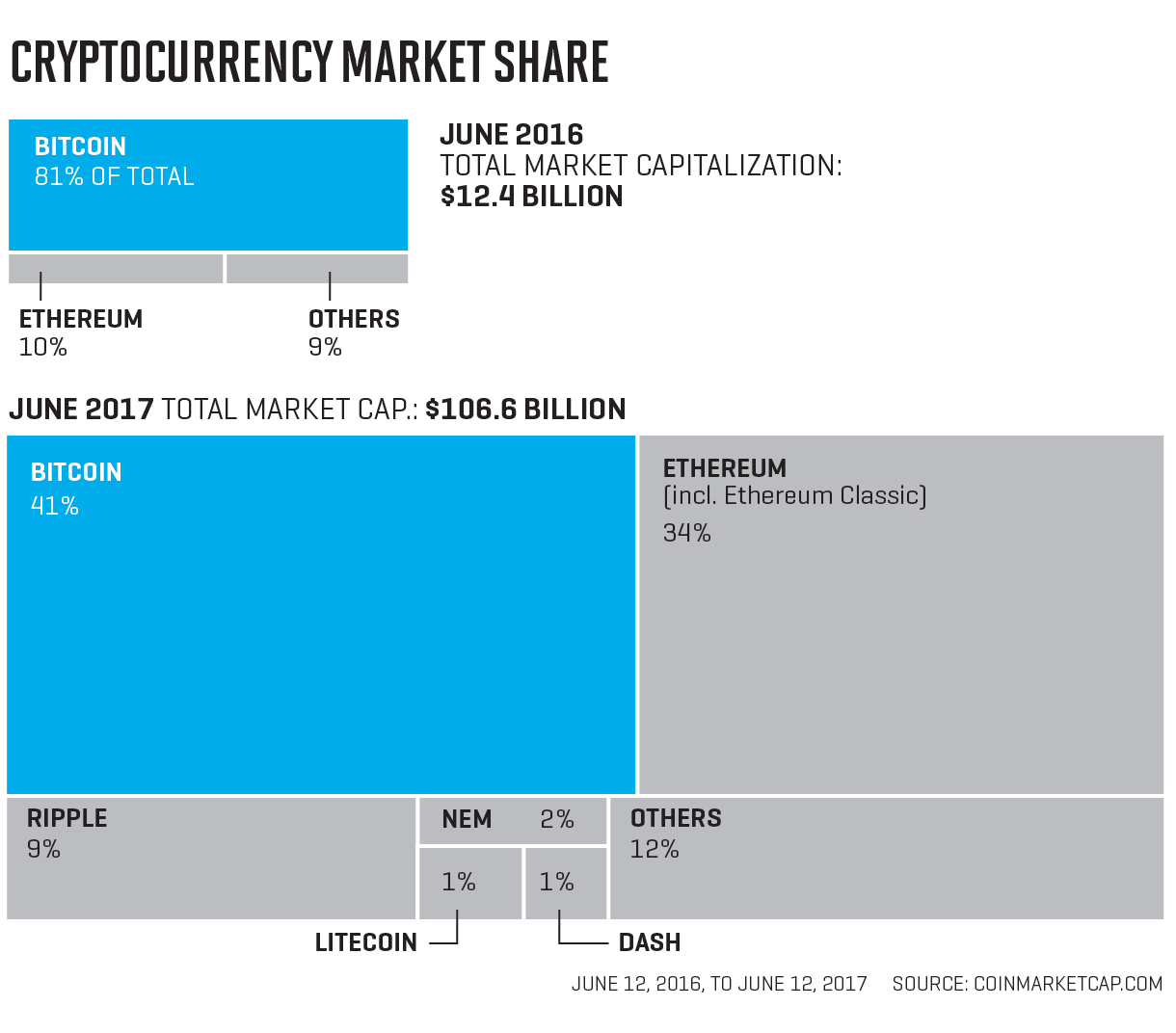It’s happening just as digital currencies are in the midst of an epic explosion. Bitcoin and its ilk are now worth $107 billion, six times their value at the beginning of the year. It’s either the beginning of a global financial realignment—or a bubble of historic proportions. These days as much as $6.6 billion in digital tokens changes hands every day, and even mainstream players such as Goldman Sachs (GS), Visa (V), Capital One, Nasdaq, and the New York Stock Exchange have invested in the underlying technology.