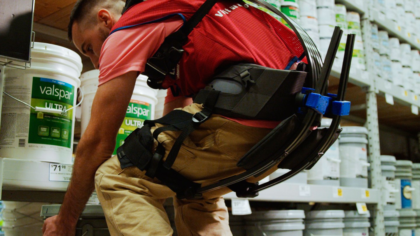 Lowe’s home-improvement stores, which partnered with Virginia Tech to develop its exoskeleton, is among a number of employers testing the technology. The suit, which resembles a long vest or mini–jet pack, uses carbon fiber rods that store energy when workers crouch. When they pick up a heavy paint can, for example, the energy is released, making it seem like they have extra muscles.