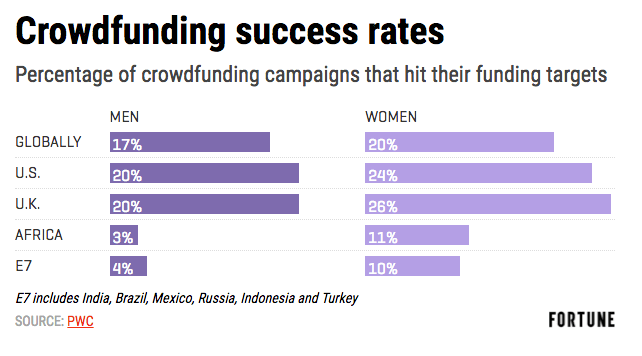 A new report by PricewaterhouseCoopers and The Crowdfunding Center found that globally in 2015 and 2016 women-led crowdfunding campaigns were 32% more successful than male-led efforts in hitting their funding targets.