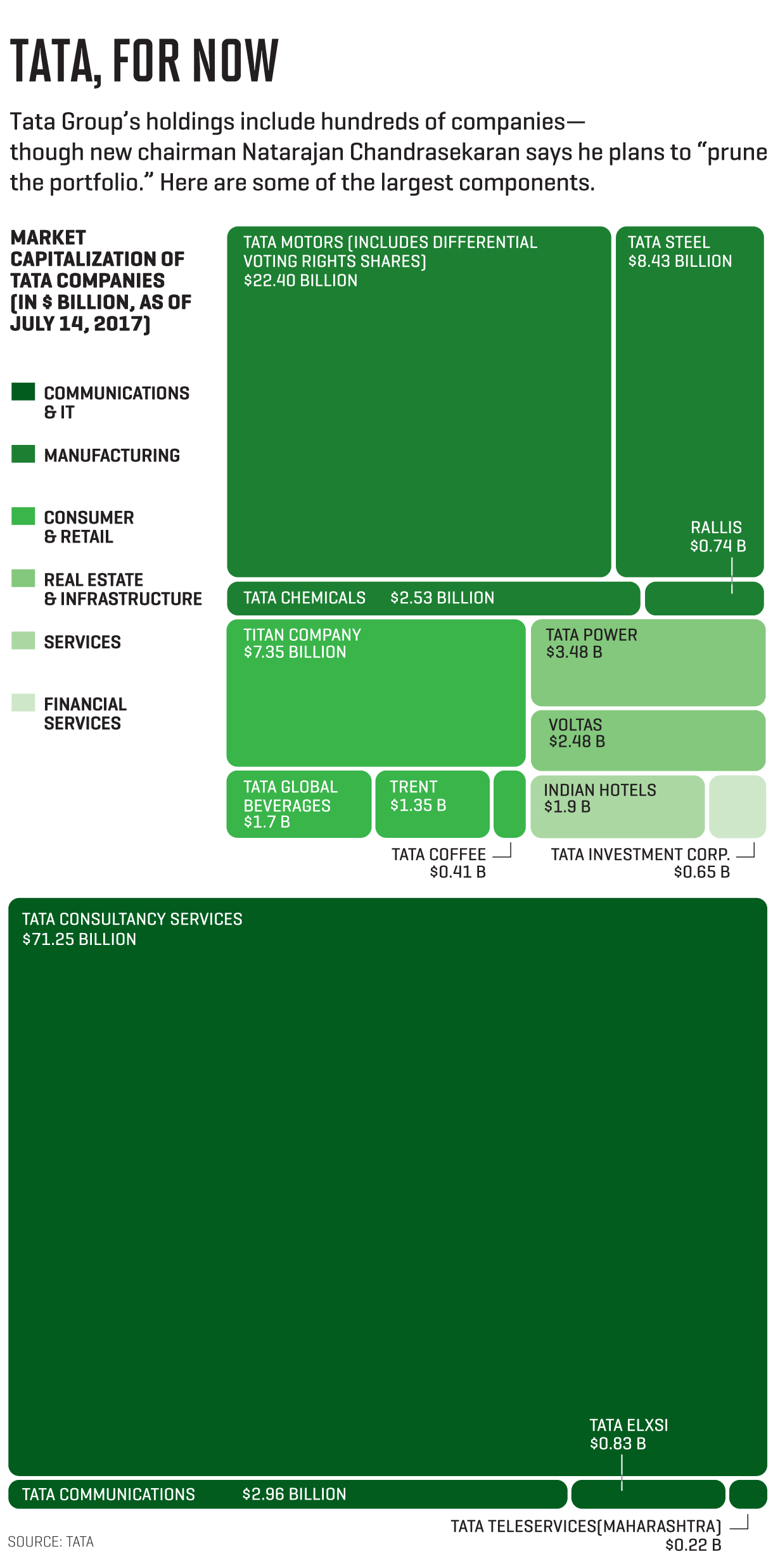Over its 149-year history, the Tata Group has metamorphosed into a sprawling conglomerate whose modern portfolio is often described as ranging “from salt to software.” That’s literally true: It owns India’s largest packaged salt brand, TCS, and myriad companies in between. But the phrase only hints at the diversity of the Tata’s empire. The group’s biggest business by sales is Tata Motors (TTM), which ranks No. 247 on this year’s Global 500, with revenues of $40.3 billion. Other holdings include India’s second-largest steelmaker; the nation’s largest power company; a leading chemical manufacturer; a chain of luxury jewelry boutiques; a gaggle of financial services firms; a leading aerospace and defense manufacturer; and investments in 51 tea plantations stretching across India and Sri Lanka.