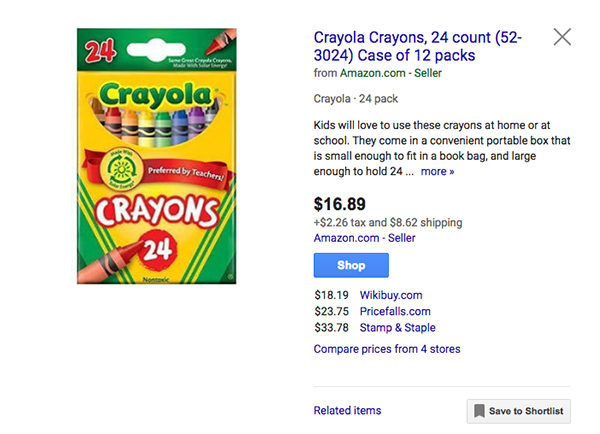 For example, in this screenshot of Google Shopping results for a 24-pack of Crayola crayons today, Amazon initially appears to be the cheapest option. But as Wikibuy pointed out, tax and shipping costs for non-Prime members would make it more expensive than some of its competitors.
