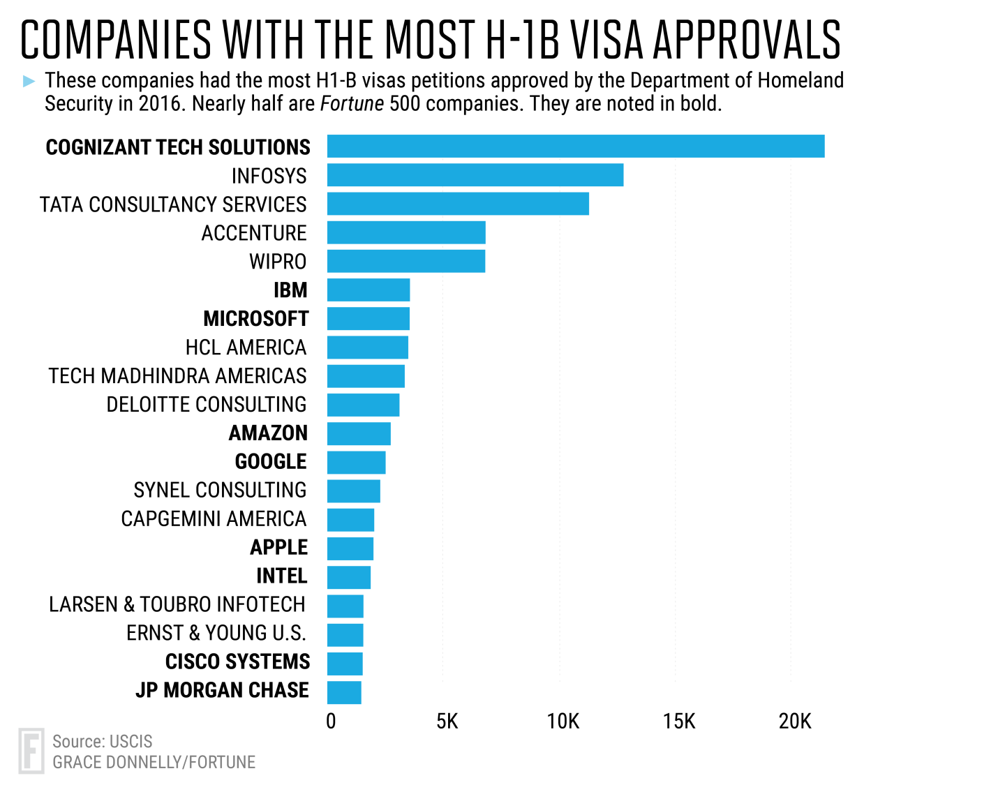 More than 40,000 companies submitted H-1B visa applications in fiscal year 2016 and the top 20 sponsors account for 37% of all visa approvals. Fortune 500 companies make up more than one-third of the 30 organizations with the most approved H-1B petitions.