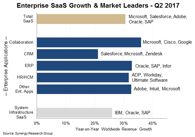 Synergy does not release revenue growth by company, but analyst John Dinsdale did say that Microsoft (MSFT) holds more than 15% of the total enterprise market while Salesforce accounts for more than 10%. Adobe (ADBE), Oracle, and SAP each fall in the 5% to 10% range, he said.