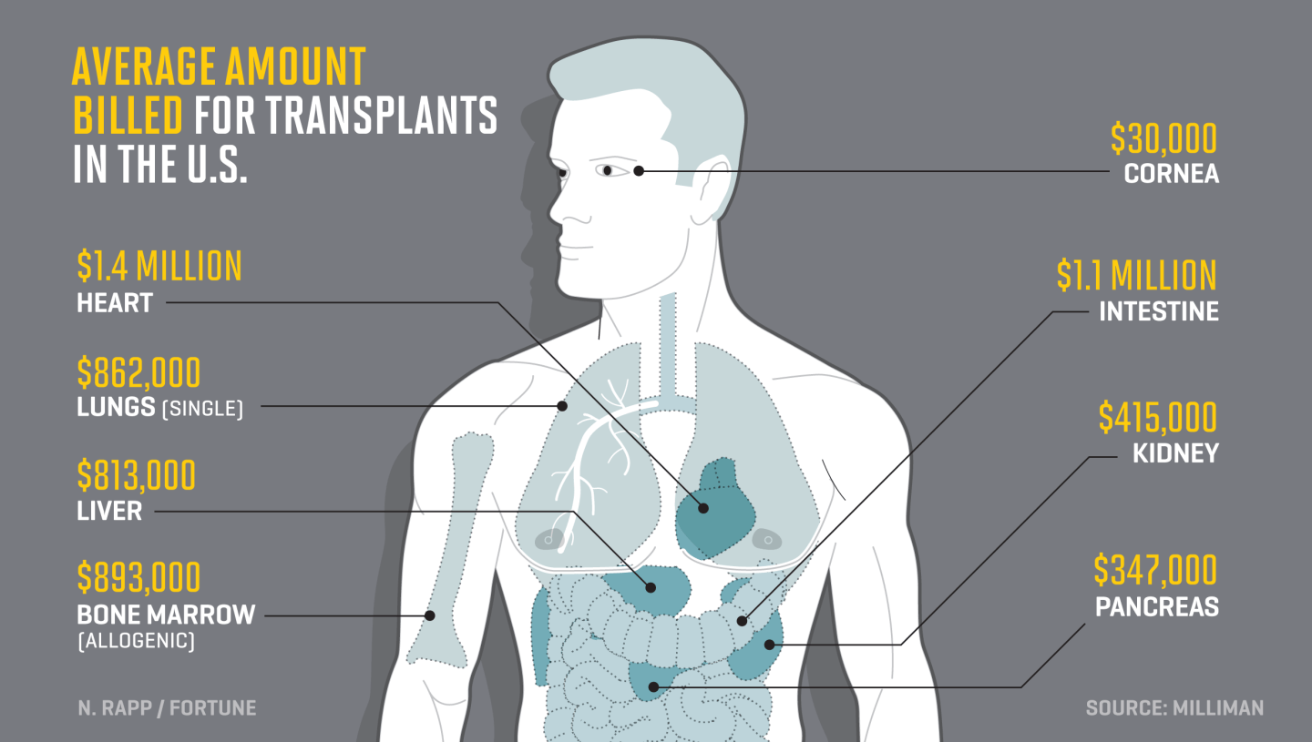 Consulting firm Milliman tallies the average costs of different organ transplants in the U.S. And while most are expensive—some are very expensive. A kidney transplant runs just over $400,000. The cost for the average heart transplant, on the other hand, can approach $1.4 million.