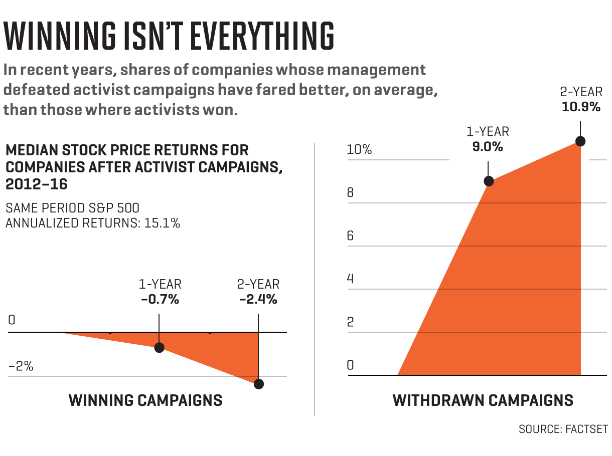 FactSet studied a total of 175 activist campaigns that were launched between 2012 and 2016, and compared the subsequent returns of two groups: companies where the dissident shareholders won, and companies where they withdrew their demands. One year after the campaigns’ end, shares of companies where activists triumphed had a median loss of 0.7%; shares of companies that fended off their advances, on the other hand, had a median gain of 9%. The gap widened after two years, with a median loss of 2.4% after activist wins and a median gain of 10.9% for successful resisters. Separate research, from Bank of America Merrill Lynch, found similarly deflating results: The one-year alpha—the amount by which a stock outperforms its benchmark—after the beginning of the average activist campaign dropped from 52% in 2012 to –5% in 2015.