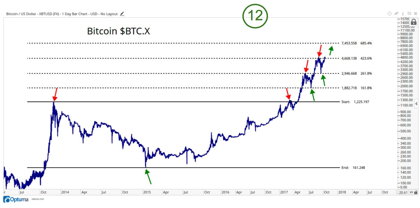 “Talk about Fibonacci—I mean, dude, does it get any cleaner than this?” Parets said last week in a presentation at the Stocktoberfest conference, hosted by the financial social media site Stocktwits in Coronado, Calif. With Fibonacci, the length of the next segment is equal to the sum of the two preceding segments. In Parets’ chart above, he shows that Bitcoin’s rallies, since the price surpassed its 2013 high, have followed a similar pattern, where each new leg up corresponds to a percentage increase as predicted by the Fibonacci series.
