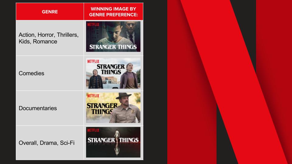 For instance, if Netflix’s data shows that you prefer comedies to dramas, then that will affect the lead image you see when Stranger Things pops up in your feed of recommended shows on the main Netflix page. Fans of horror programming will see a lead image featuring actress Millie Bobby Brown’s Eleven character staring out ominously at them, while comedy fans will see a more innocuous image of the characters Nancy and Jonathan looking astonished by something off in the distance.