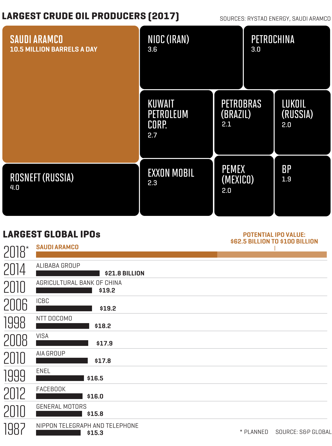 Indeed, when Saudi Arabia’s Crown Prince Mohammed Bin Salman, commonly known as MBS, unveiled his plans in January 2016 to take some of Aramco public, it stunned even the company’s own executives. The IPO, as it turned out, was the centerpiece of a radical blueprint called Vision 2030 that the 32-year-old heir to the throne had crafted in order to overhaul the country over 14 years. Aramco’s dizzying oil production—more than 10 million barrels a day—generates about 90% of Saudi Arabia’s revenues and most of its foreign earnings. The proceeds from an IPO—a 5% slice of $2 trillion would be $100 billion—could potentially turn the government’s Public Investment Fund into a global financial player.