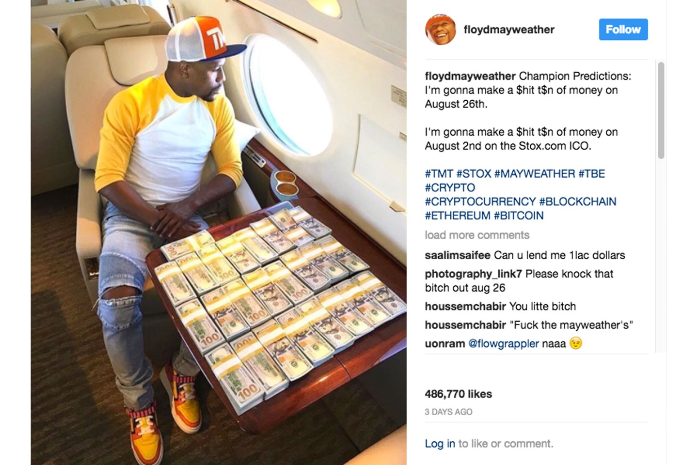 Unlike the one above, subsequent posts by Mayweather included text to suggest they were paid endorsements. The disclosures, however, were not especially conspicuous (in some cases amounting to just the hashtag #ad), and it’s unclear if they would be sufficient for the SEC rules.