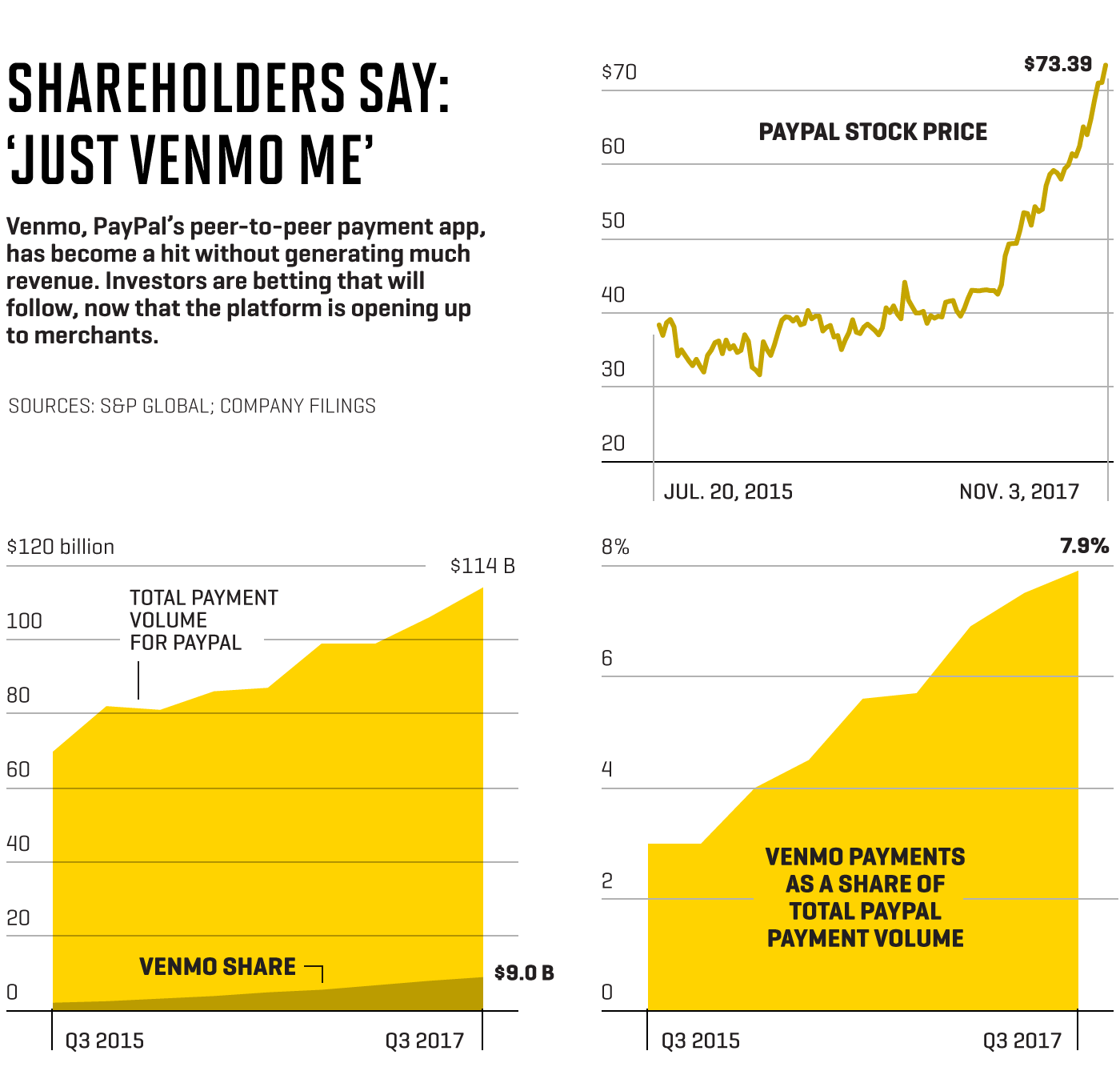 Since coming on board to run the newly independent company, after stints at American Express, Sprint, and Virgin Mobile—where he was the founding CEO—Schulman has made some shrewd bets. Opening up PayPal’s platform so that other big players, like Facebook, can build upon its payments software has proved to be a savvy move, enabling more consumers to make PayPal (PYPL) their default payment option. And acquisitions that predate Schulman’s arrival are also showing impressive growth under his guidance. In particular, Venmo, a peer-to-peer payments app popular with millennials, is starting to deliver on its promise. Schulman recently announced plans to roll it out to millions of merchants. That’s important because most of Venmo’s estimated 10 million regular users don’t pay transaction fees—but merchants will, so PayPal can convert its popularity into more revenue.