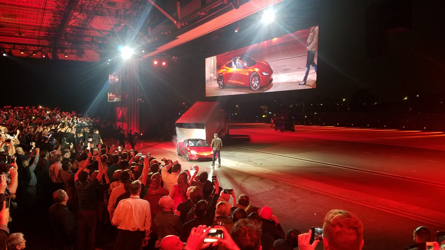 Von Holzhausen drove the Roadster out from the back of the Tesla Semi, at what appeared to be the end of Musk’s presentation. After the vehicle’s entrance, von Holzhausen stopped, then sped away, only to come cruising back at high speed—the Hawthorne Airport’s runway in the background.