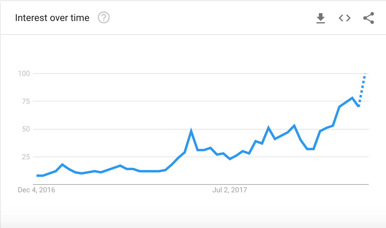 Some signs do point to an influx of new interest—and therefore new investors. As Bitcoin prices have surged, so has Google search interest in the asset (as the chart below reveals). Meanwhile, the number of users on the largest U.S.-based bitcoin exchange, Coinbase, jumped by at least 300,000 between Nov. 22 to Nov. 26., Bloomberg reports. Coinbase now has about 13.3 million users.