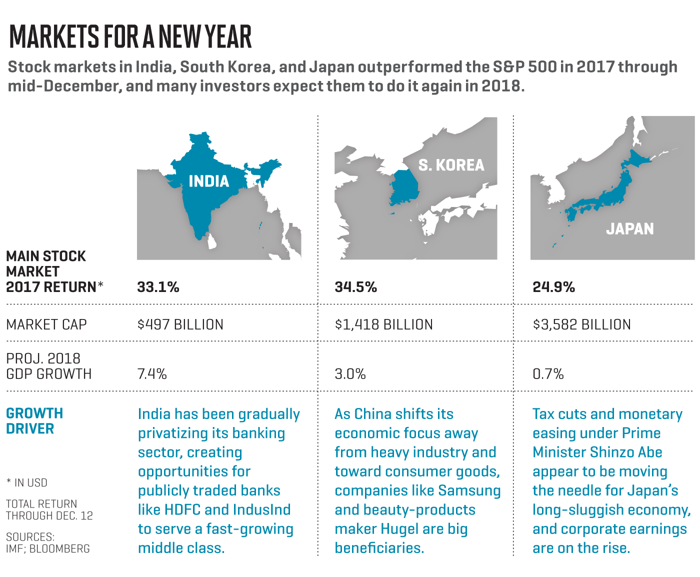 Many money managers expect the trend to continue in 2018. With U.S. stocks riding at high valuations after nearly nine years of a bull market, the world outside is looking less expensive, with the ex USA index trading at 14.5 times forward earnings, compared with the S&P 500’s 18 times. “We still see more upside in emerging markets, Europe, and Japan than in the U.S.,” J.P. Morgan Asset Management managing director Paul Quinsee recently told clients. And that upside looks particularly big in India and East Asia, where newly minted middle-class consumers are helping companies generate big gains for investors. Here are three markets stirring excitement.