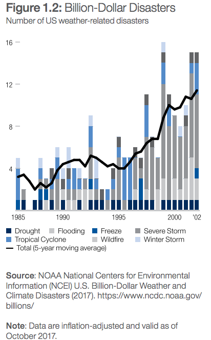 They point specifically to the destruction by hurricanes and other extreme weather events in the U.S. that scientists say are linked with climate change, such as America’s record-breaking summer and winter storms in the past year. Such cascading events take an immediate toll on human life, disrupt local businesses in the short term, and can devastate local economies for years by destroying infrastructure. The 2017 Atlantic hurricane season in the U.S. was the costliest one to date.