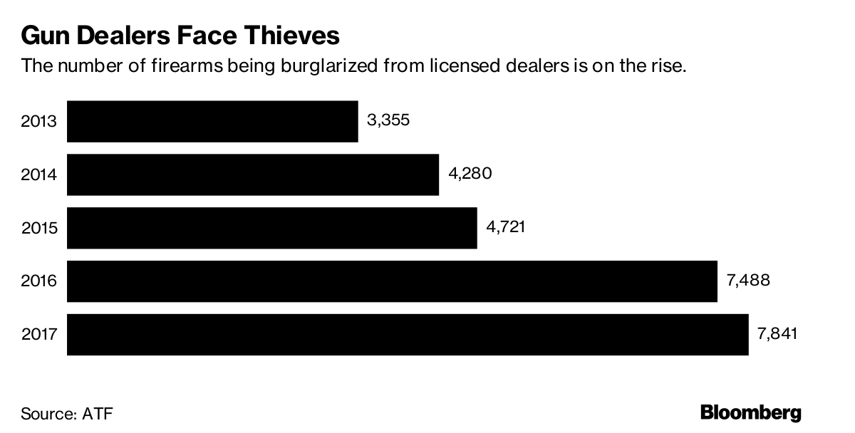 The number of robberies of federal firearms licensees reported to the ATF have increased 227% since 2013 and burglaries of such gun purveyors are up 71% over that same period.