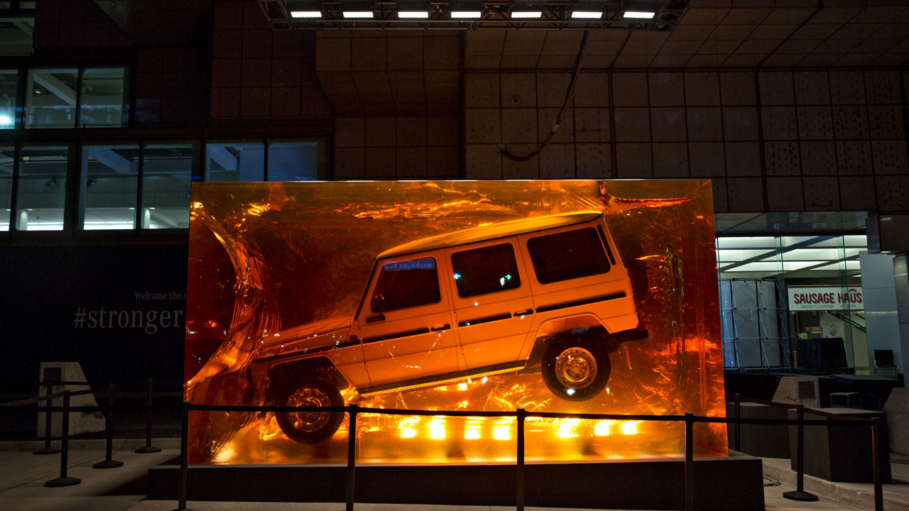 The installation symbolizes “the timelessness of the off-road legend and makes a conscious reference to the natural phenomenon of insects preserved in amber,” Mercedes says.