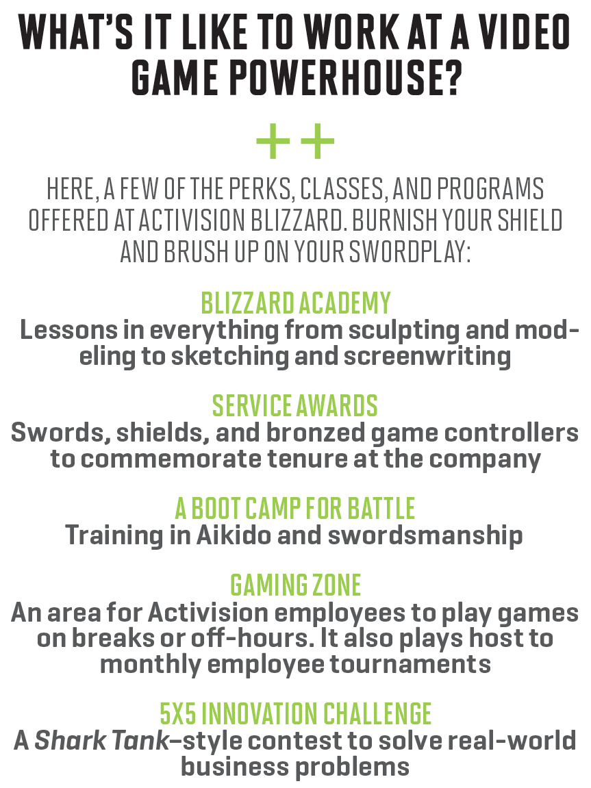For this is the sovereign kingdom known as Blizzard Entertainment, part of the great California empire known as Activision Blizzard (No. 84 on this year’s 100 Best Companies to Work For list), where beyond the slow-moving security gates is a world most corporate denizens can only dream of.