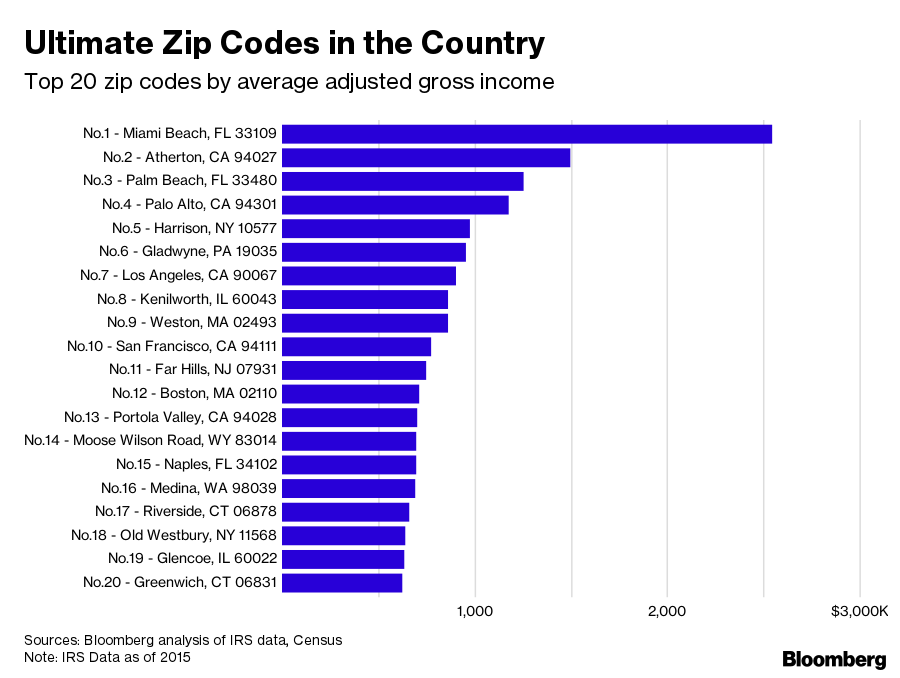 The average income in Fisher Island, zip code 33109, was $2.5 million in 2015, according to a Bloomberg analysis of 2015 Internal Revenue Service data. That’s $1 million more than the second-place spot, held by zip code 94027 in Silicon Valley, also known as the City of Atherton on the San Francisco Peninsula. The area’s neighbors include Stanford University and Menlo Park, home to Facebook and various tech companies. While the IRS data only provide the averages of tax returns, which can be skewed by outliers, Fisher Island is the only zip code in the Bloomberg analysis where more than half of all tax returns showed an income of over $200,000.