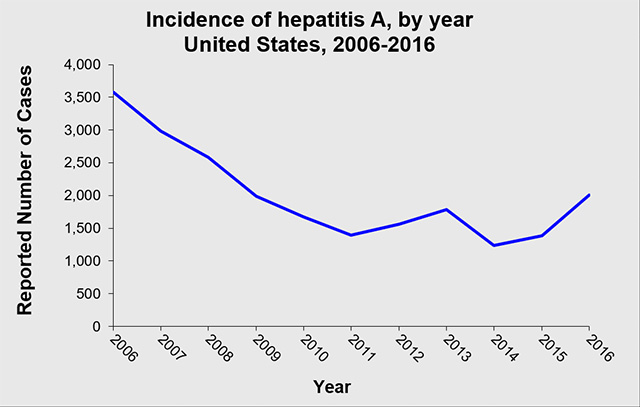 “[T]he first increase between 2012 and 2013 (1,562 and 1,781 reported cases, respectively), was due to a large multi-state outbreak,” says the agency. “Between 2015 and 2016, the reported cases again increased by 44.4% from 1,390 in 2015 to 2,007 cases in 2016. The 2016 increase was due to two [hep A] outbreaks linked to imported foods.”