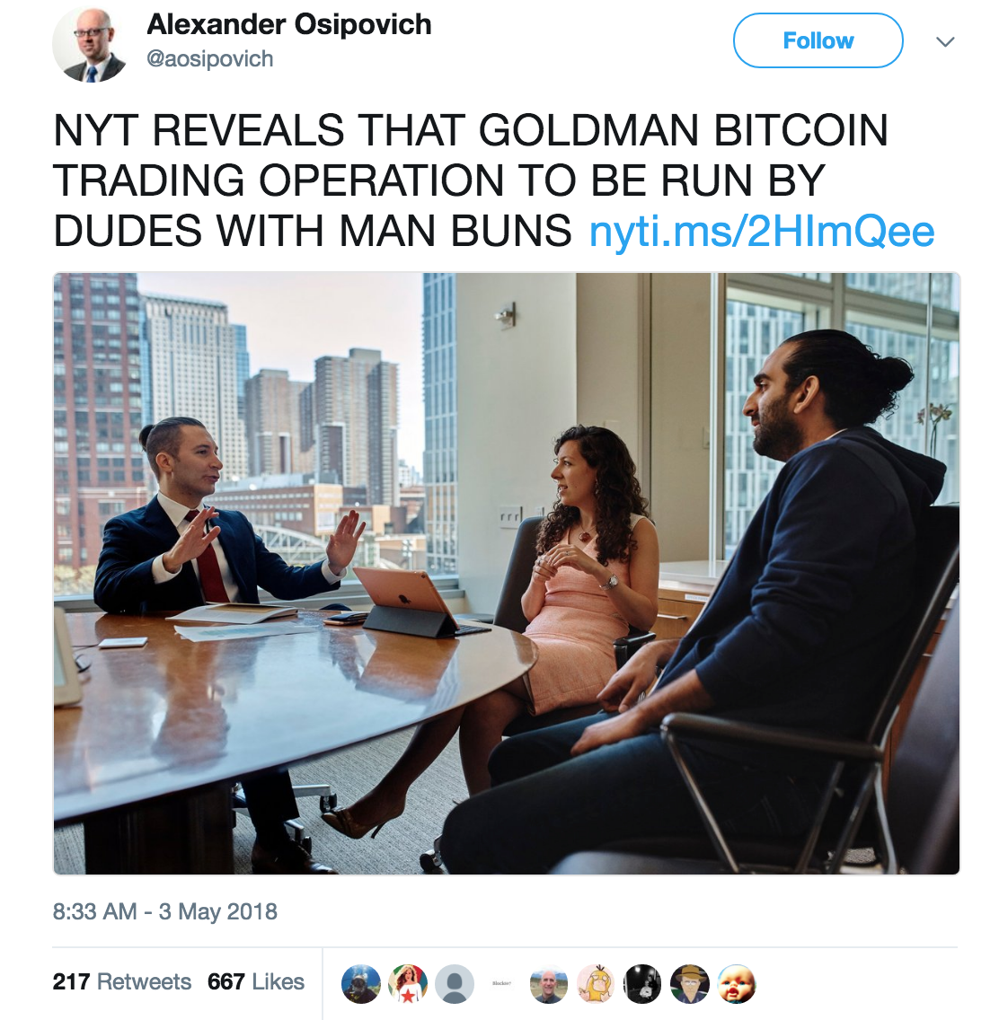 The New York Times article about Goldman Sachs's new Bitcoin trading operation included the below photo with this caption: "Justin Schmidt, left, who will run Goldman Sachs’s Bitcoin operation, with Marianna Lopert-Schaye, vice president of principal strategic investments, and Neema Raphael, who leads research and development."