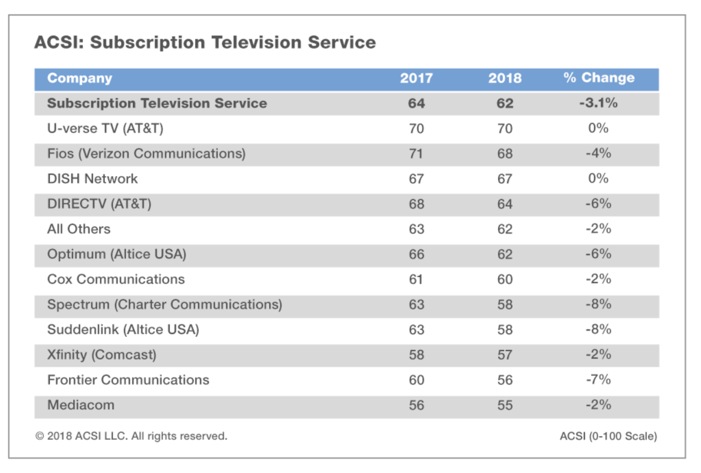 This year was no different, though the dissatisfaction is worsening. Cable TV companies averaged a score of 62 on the ACSI’s 100 point scale, down 3% from last year and the lowest rating for the industry in 11 years. Cable TV tied for the lowest average score among the 46 different industry groups in the survey, with Internet service providers ranking equally poorly. Not surprisingly, many of the same companies, such as Comcast and Frontier Communications, are in both groups. The top-ranked companies in 2018 were TV set makers, with an average score of 85; breweries, which averaged 84; and soft drink makers, also scoring an average of 84.