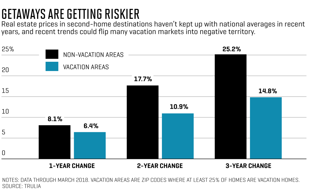 More recent sales data is harder to track down—the realtor association recently announced that it would no longer publish a vacation-home survey, citing the costs and challenges of figuring out which homes are primary residences and which are part-time. But other analysts say the slowdown has continued—and that it’s likely to get worse before it gets better. And the numbers back them up. To help Fortune analyze vacation-home price trends, real estate site Trulia looked at zip codes in which at least 25% of residential properties were identifiable as vacation homes. While prices in those zones rose a respectable 14.8% in the three years through March, they badly lagged prices in non-vacation areas, which increased 25.2%—a difference of more than 10 percentage points.
