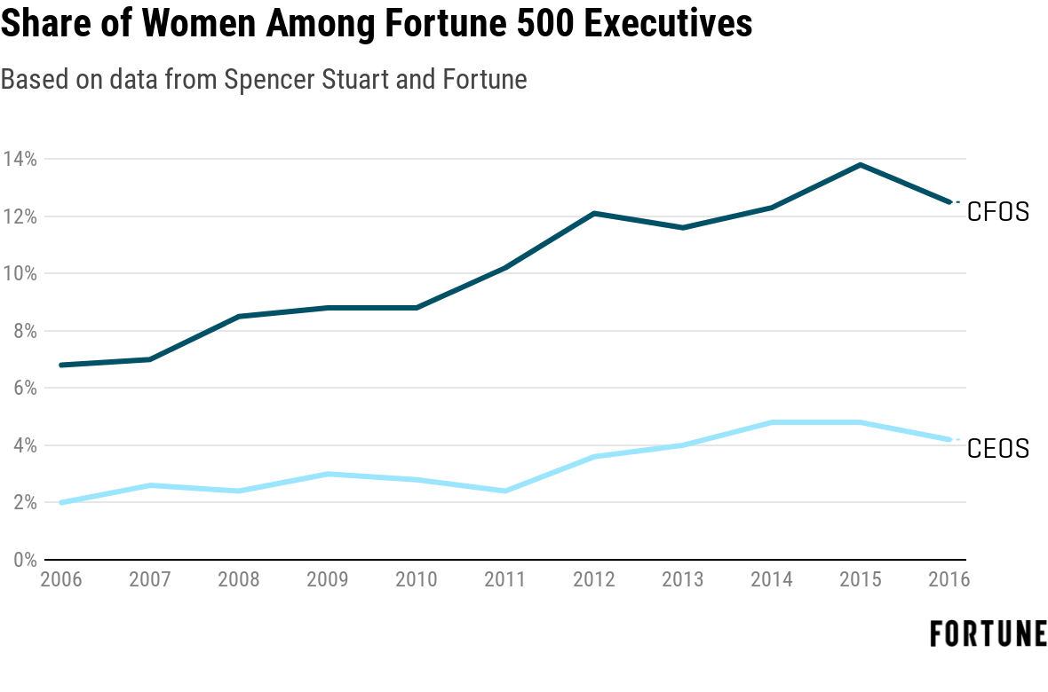 In taking on the CFO role, Suryadevara joins a class of female chief financial officers that's grown in recent years. According Fortune data, there are currently 64 CFOs in the Fortune 500, making up 12.8% of all such execs. In 2016, according to Spencer Stuart's most recent report, 12.5% of Fortune 500 CFOs were women. A decade earlier, they represented 6.8%. By comparison, women represented 4.2% of Fortune 500 CEOs in 2016, and 2% in 2006. (As of May, female CEO ranks stood at 24, or just under 5%.)