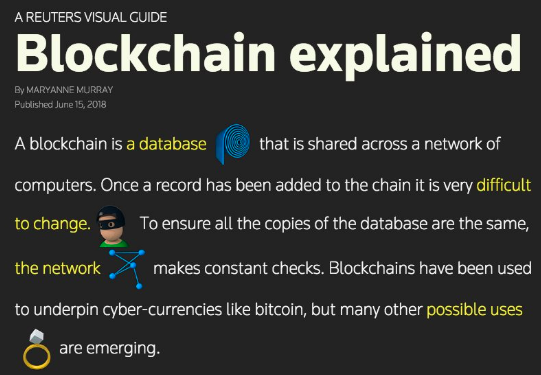 Visual explainers can be a fantastic tool for understanding complex ideas. Reuters this week tried if for the blockchain—with mixed success. Here's the introductory graphic: