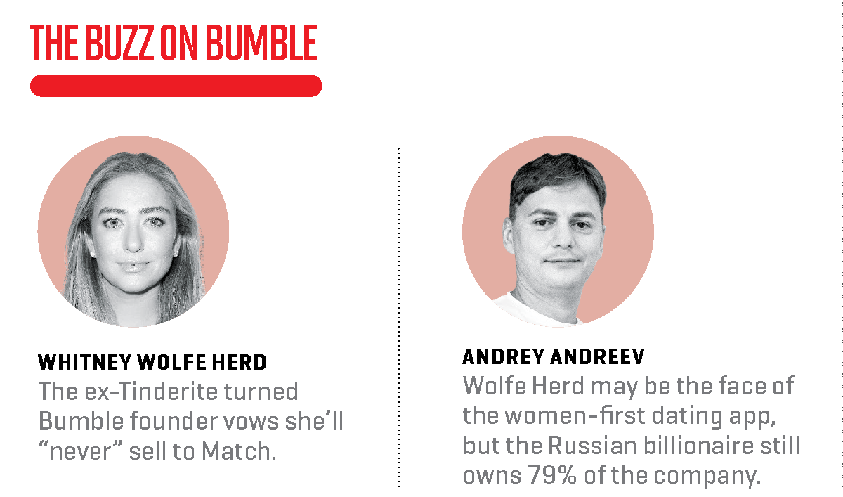 Bumble may be the David to Match Group’s Goliath, but it has a Goliath-size backer of its own: Wolfe Herd has proved to be a gifted entrepreneur in her own right, but she created Bumble with the help of Andrey Andreev, a London-based Russian billionaire entrepreneur and the founder of Badoo. The two cooked up the idea together, and Andreev owns 79%, Wolfe Herd 20% (the remaining 1% is split between two additional employees). Bumble operates out of Austin, but engineering, development, and other infrastructure is handled by Badoo’s teams in London.