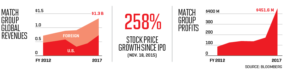 The app is the rare example of a breakthrough innovation coming not from a startup but from inside a large company. “It’s probably one of the great internal incubations of all time,” boasts IAC CEO Levin. Tinder also nailed a business triple axel: Since millennials weren’t previously big users of online dating sites, it unlocked an entirely new customer group. It grew virally all over the world with almost no marketing expenditure. And even now it’s posting impressive numbers, with paid subscribers nearly doubling from 2016 to 2017. When Ginsberg reported Match’s first-quarter results in early May, the company raised its revenue outlook for the year by $100 million—largely on Tinder’s growth.