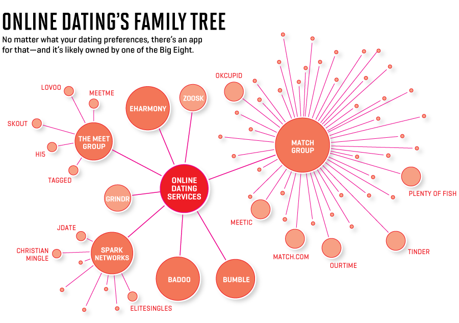 Match Group is the conglomerate parent to 40-plus brands in more than 42 languages, including Match.com, the granddaddy of the industry most popular with 30- to 50-year-old relationship-seekers; OkCupid, which took hold among urban hipsters by asking daters to answer a list of quirky ice-breaker questions (“Would you ever sleep with a serial killer?” “Are you annoying?”); Plenty of Fish, popular in the non-coastal U.S.; and Tinder, the revolutionary dating app that gave the world the “swipe” and all that came with it. The company’s biggest competitors include eHarmony, known for its ads featuring founder Neil Clark Warren and its focus on long-term relationships; Spark Networks, the $135 million publicly traded (ticker symbol: LOV) parent of Jdate, Christian Mingle, and others; Badoo, which claims 380 million users worldwide but is used primarily overseas; and Bumble, the fast-growing upstart created in 2014, which